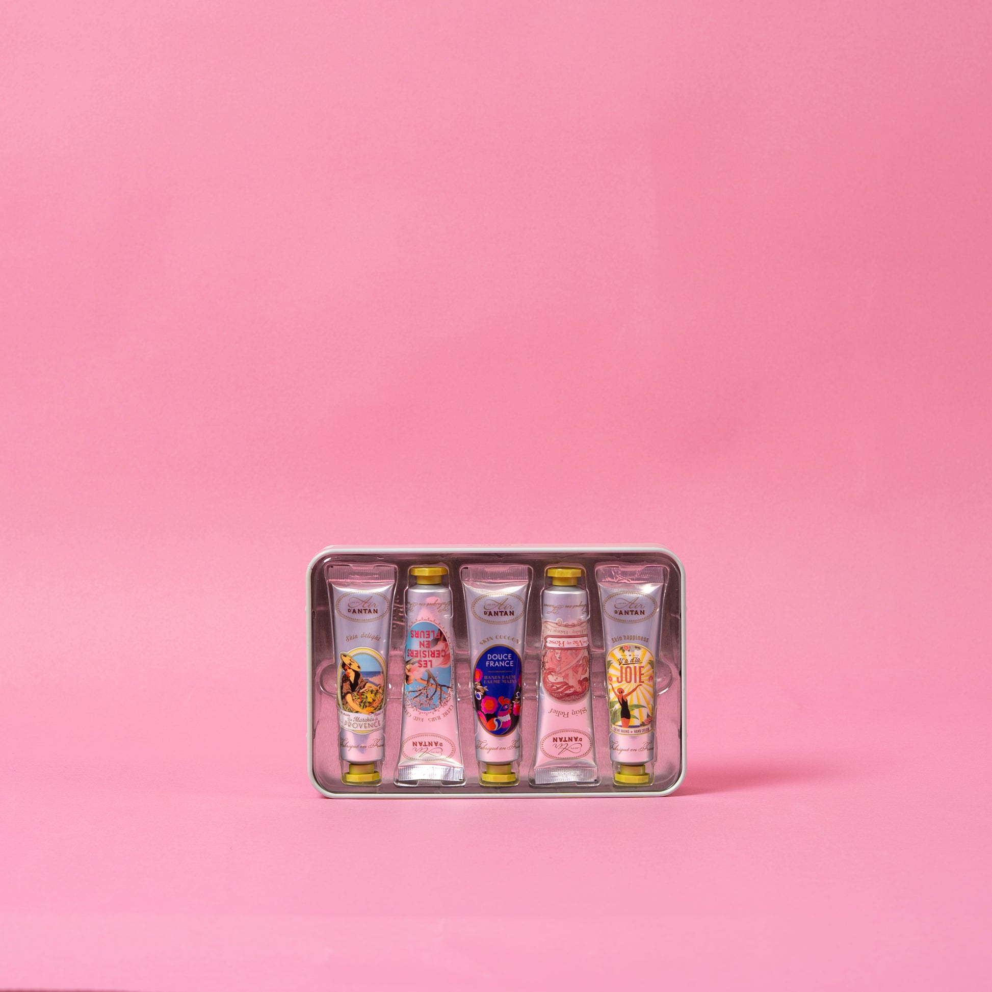 Crafted and formulated in the perfume capital of the world, Grasse (Provence), France. Dermatologically tested and are cruelty-free. Includes 5 x 0.08 oz Hand Creams: Les Marchés de Provence (Verbena and Bergamot), La Vie en Rose (Rose, Peach, and Patchouli), Y'a d'la Joie Hand Cream (Orange Blossom, Rose, and Lily of the Valley), Les Cherisiers en Fleurs (Cherry Blossom) and Douce France (Almond, Fig, and Vetiver).