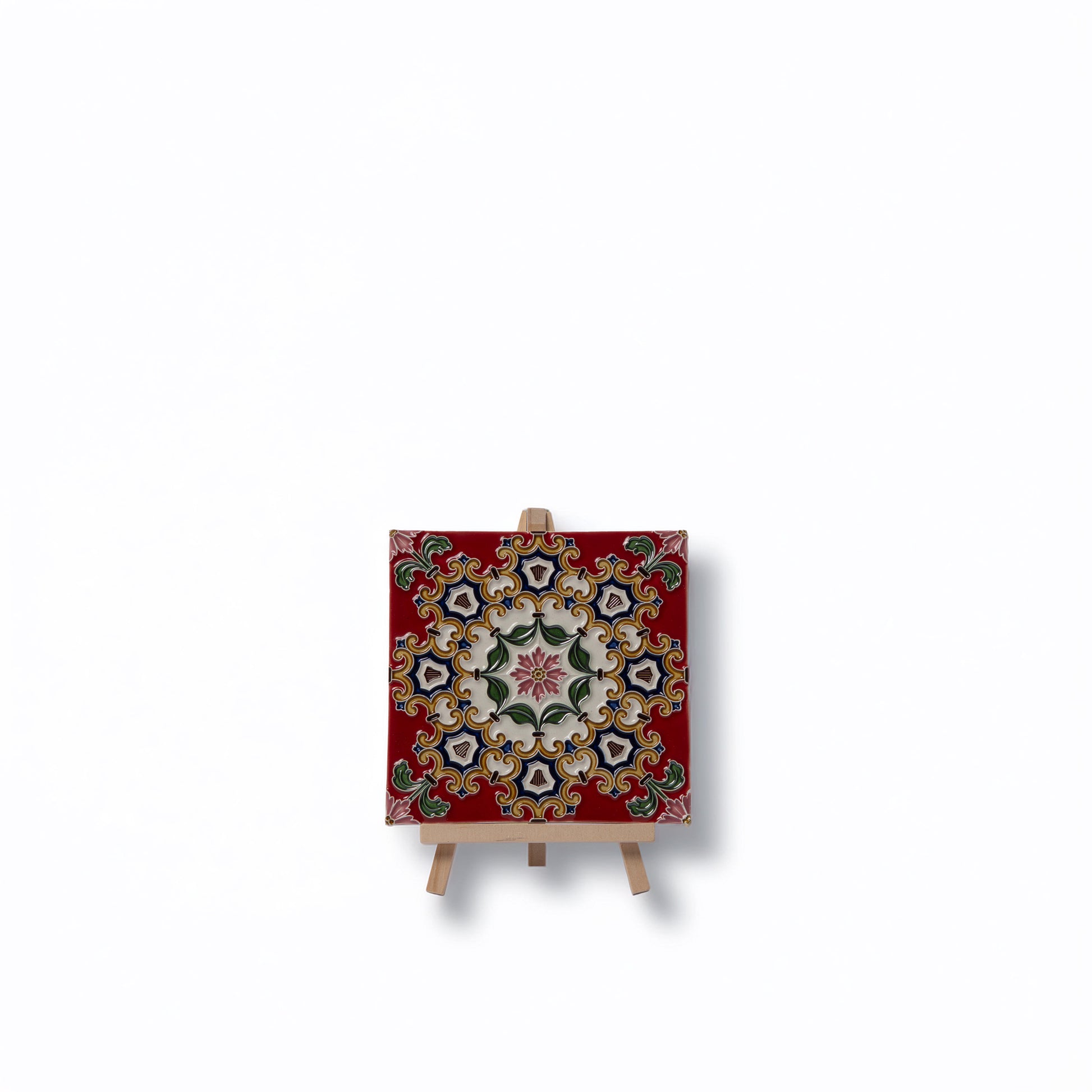 Radiating warmth and old-world charm, this hand-painted tile features a vibrant crimson background with a floral medallion design in gold, navy, and green. Inspired by classic Portuguese azulejos, it blends heritage craftsmanship with rich, joyful color. The included wooden easel turns it into an instant art piece—no framing required.