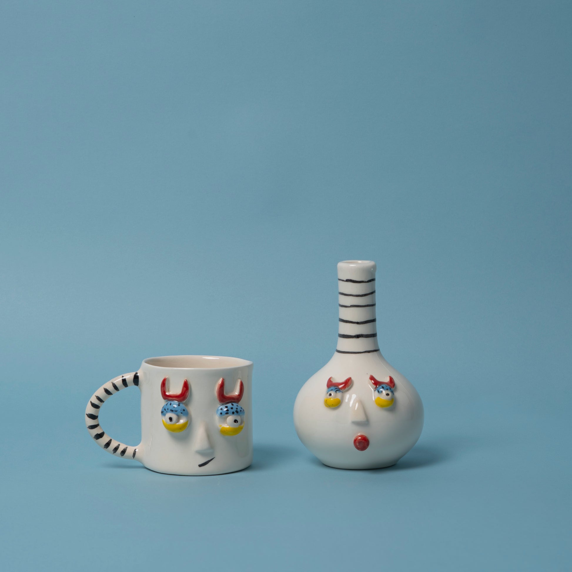 This cheeky handcrafted duo from Porto, Portugal, captures the bold spirit of Portuguese artisan ceramics with a surrealist twist. Featuring one character mug and one sculptural bottle, each piece is hand-sculpted and painted with signature devilish lashes, striped handles or necks, and expressive faces full of attitude. The mug is perfect for sipping with a smirk, while the bottle moonlights as a small vase or standalone objet d’art. Whether displayed as a quirky pair or used daily, this set celebrates mischief, play, and the magic of handmade.