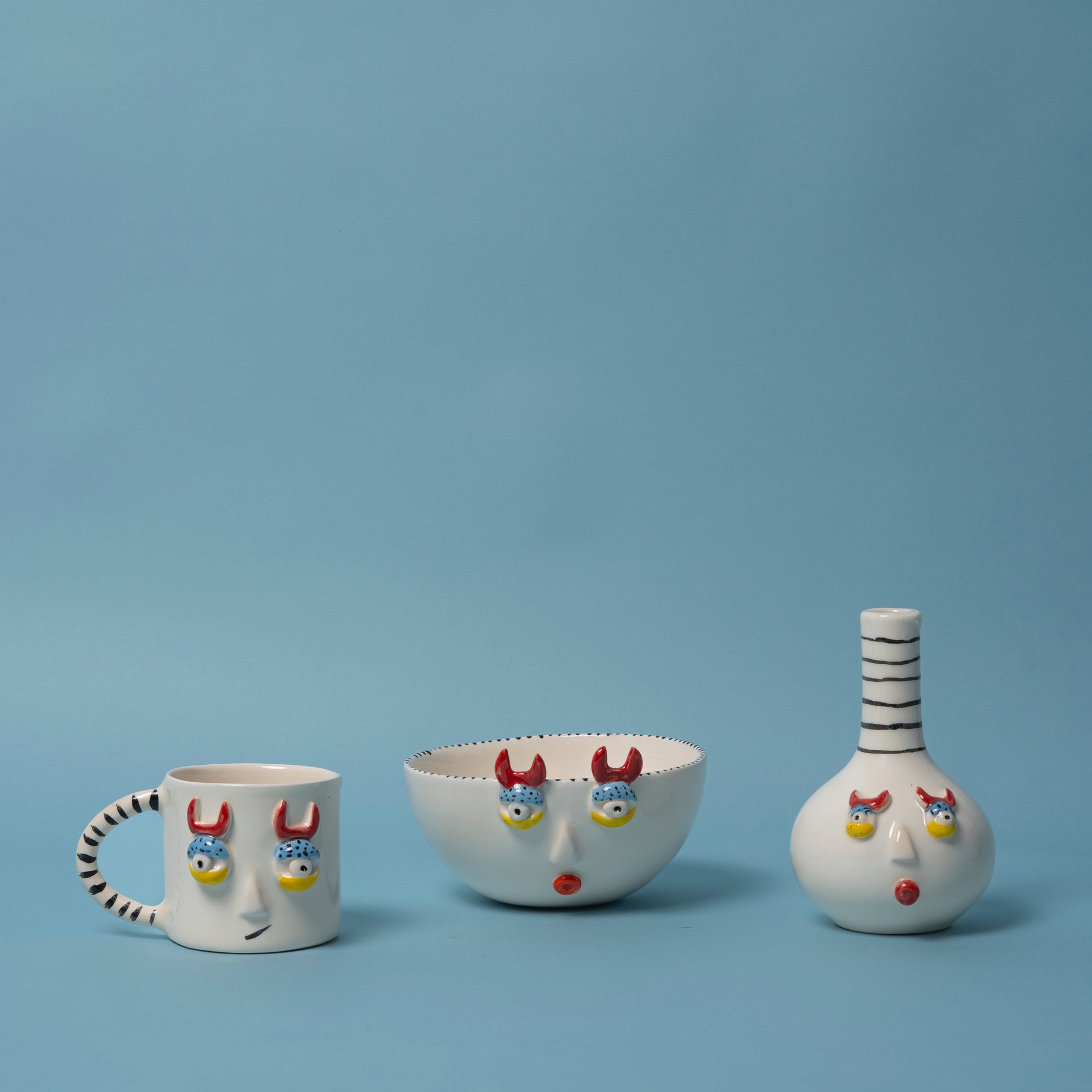 Meet the full cast of characters: a mischievous mug, a horned sculptural vase, and a wide-eyed bowl—each one hand-sculpted and painted by artisans in Porto, Portugal. This ceramic trio radiates playful energy and surreal charm, with devilish lashes, expressive faces, and bold black-striped accents tying the set together.